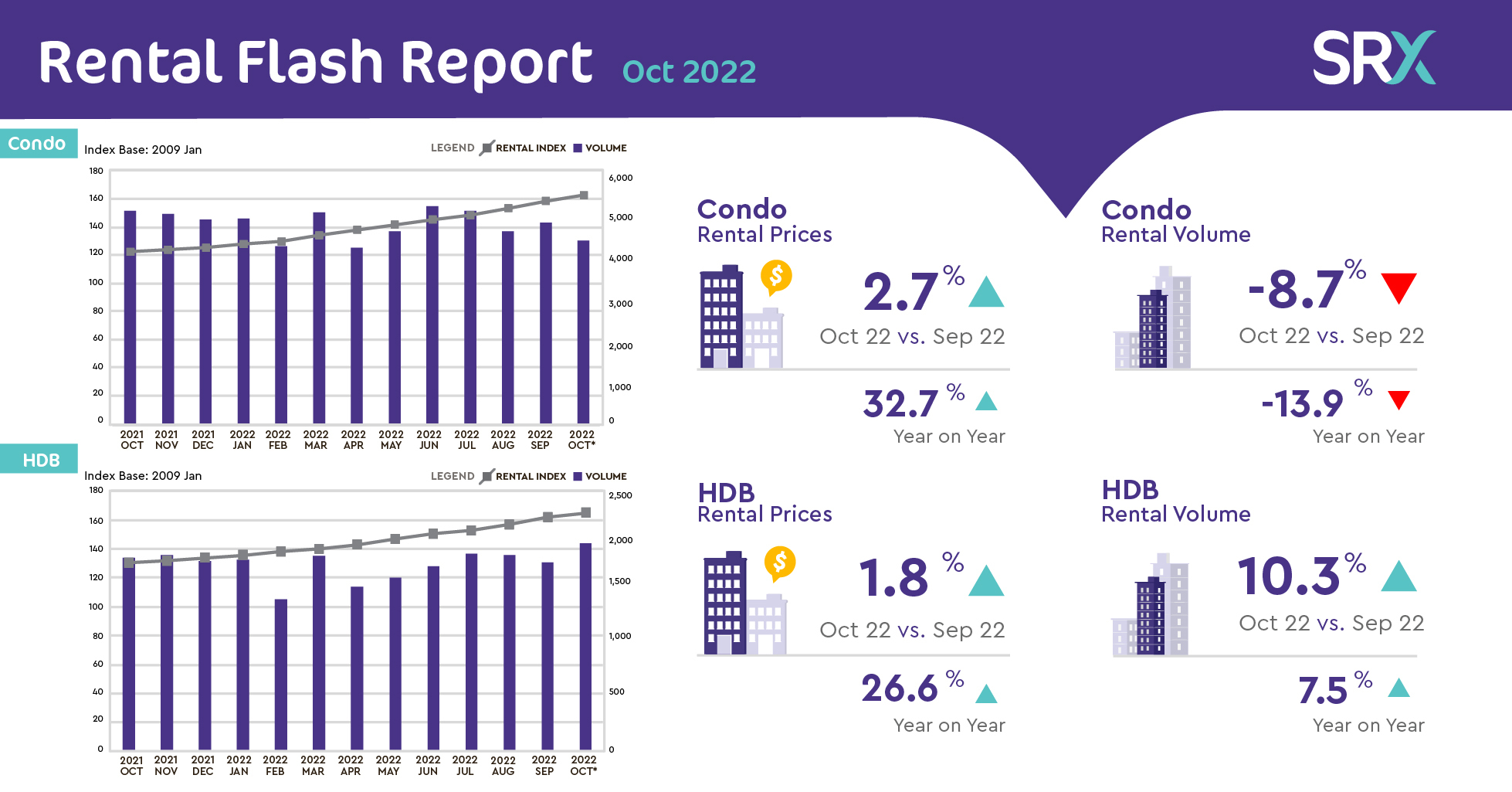 Year-on-year, overall Condo rents increase by 32.7% and overall HDB rents increase by 26.6% from October 2021.
